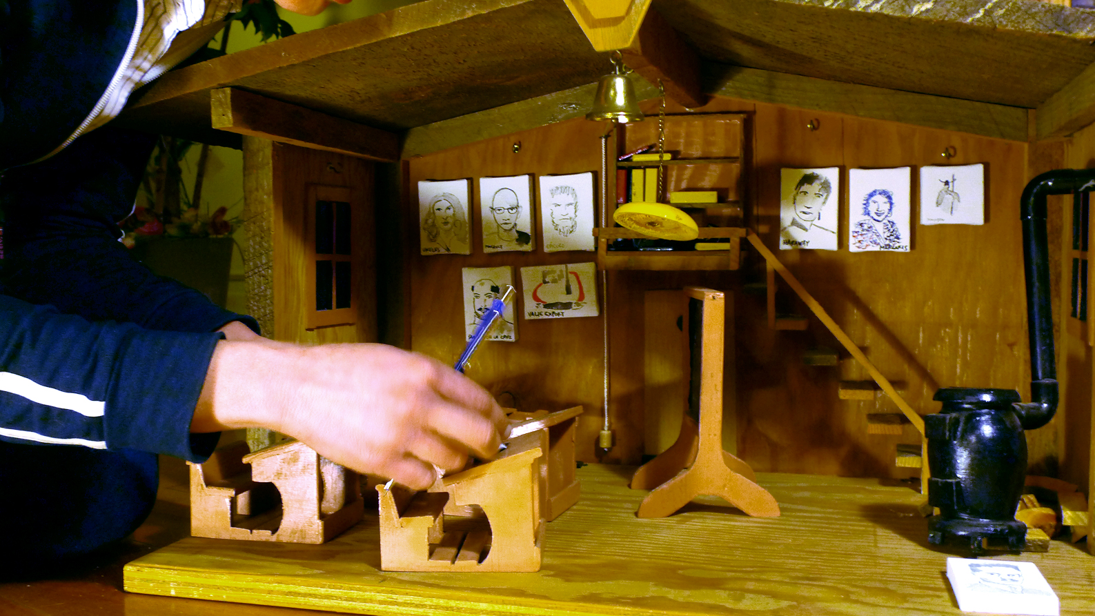 How can we write about a process within the process, rather than as an afterthought, retrospectively? Making miniatures requires undivided attention. When I try to describe my process I have to remember that state, but it is not there anymore. I intended to play with that gap by writing in miniature: on miniature notebooks on a miniature desk. The first element that appeared in the writing, while writing in small notebooks on small desks, was the awareness of the forced position of the body. I realized that I should keep it, in the context of the performance, for a predefined amount of time, like the duration of a school class. I was writing unceasingly [2], remembering in the body those courses where the teacher was speaking for the whole period and we had to copy what she was saying. It was forced miniature time[3]. In Zen meditation, the correct disposition of the mind comes from the correct disposition of the body. Being in that position, embracing the miniature, made me pay attention to aspects I did not consider before. All the small details of the miniaturized school (the firewood, the curve of the desks, the books) appeared now as individual caring actions from a person to his grandson, a material transference of knowledge. “[M]iniature[s] are false objects that possess a true psychological objectivity” (Bachelard, 1994, p.148). In relation to my own research time, albeit playing, I was positioning it in relation to my references (with the portraits on the wall) and in connection with my domestic context, in a literal and figurative way. However, from the new perspective I adopted, new questions appeared. The portraits, for example: I produced portraits of people that were academic influences for me in general, like national heroes in a school, avoiding too contemporary references. Should I make them, on the contrary, specific to what I was writing about, like a drawn bibliography? What should be the output of my writing? Which other elements belong to my classroom, my contained research space? The engagement with the miniature was producing theoretical and practical questions (if that division is relevant) with results (or failures) at different levels. As Anna Munster stated, “Embodiment is the very process through which the domain of the cultural, technical or aesthetic and the register of the affective, get pulled together” (2012, p.42). The critical play[4] with the small classroom allowed me to embody, and to question, concepts and techniques. In addition, it offers an interesting take on the understanding of technology as practice (Franklin, 1999, p.12), due to the denaturalized exploration of technologies, practices and objects that a critical play with miniatures enables.